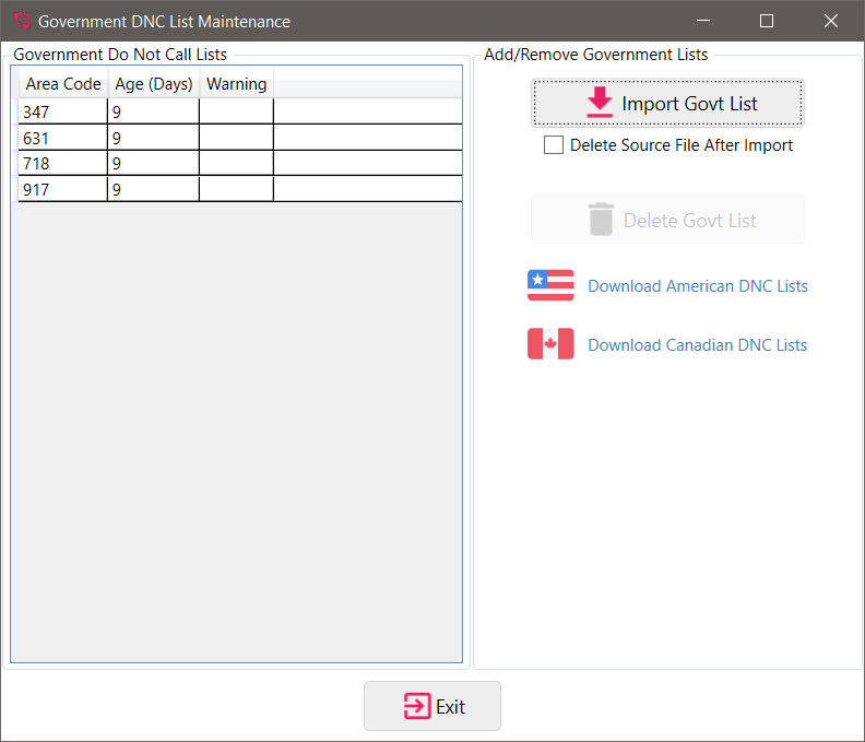 A government list is any list released by a Federal, State, or Local entity. Most lists conform to the FTC standards and should be “Importable” by this application. To import a Government list click the”Govt DNC Lists” button in the DNC List Maintenance tab.